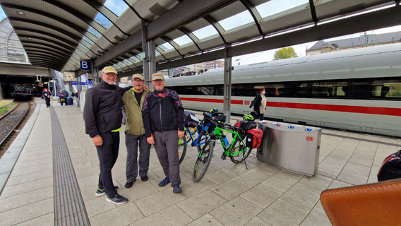 Gelassen beluden wir die Räder und mussten noch einmal für das kurze Stück zum Bahnhof die Regensachen drüber ziehen, da es nun konstant und kräftig regnete. Wir verabschiedeten uns von unserer netten Vermieterin und machten uns vorsichtig über das nasse Pflaster auf den Weg zum Hauptbahnhof. In wenigen Minuten hatten wir diesen Erreicht und standen auf dem Bahnsteig. Da wir ursprünglich schon ab Hitzacker fahren wollten, hatten nun noch eine Menge Zeit um uns mit Reiseproviant zu versorgen. Der ICE kam einigermaßen Pünktlich und wir freuten uns noch ein wenig Schlaf nachholen zu können.