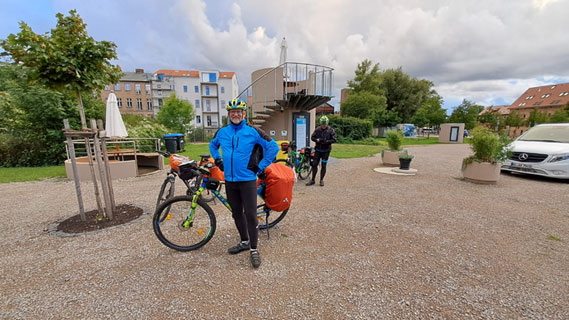 Als wir dann mit einer Stunde Verspätung um 15:30 Uhr in Stralsund eintrafen, wurden wir aber wenigstens mit strahlenblauem Himmel und Sonne begrüßt. Euphorisch luden wir die Räder aus, packten die Satteltaschen dran und fuhren gutgelaunt aus dem Bahnhof.