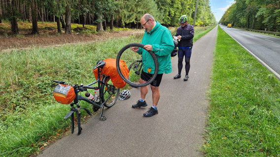 Wir radelten über Zirow schnurgerade entlang einer vielbefahrenen Landstraße. Die Aussicht bot wenig Abwechslung, Links und Rechts der Wald und dazwischen Straße und Radweg. Aber gut zum Kilometer machen. Also Kopf nach unten und Gas geben. Wir kamen gut voran bis unser Rad-Trio aufgrund eines Platten abrupt stoppen musste. Zum Glück am Vorderrad, das sollte kein Problem sein. Ein erster Flickversuch scheiterte, also tauschten wir kurzerhand den Schlauch gegen einen mitgebrachten Reserveschlauch aus und schon konnte es wieder weiter gehen.