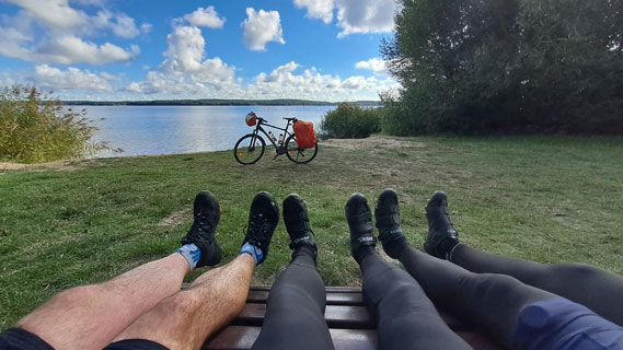 Als wir aus dem Wald kamen ging es direkt am Plauer See entlang bis zu einem schönen Strand der zu einer kleinen Pause einlud. Wir streckten unsere malträtierten Beine auf einer XXL Liege aus und genossen die wärmenden Sonnenstrahlen mit Blick auf den Plauer See. Phantastisch!