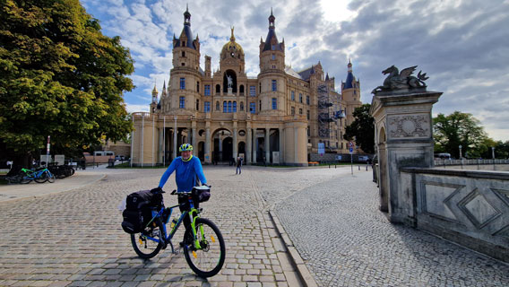 Es ging entlang des Sees, zum schönen Strand von Zippendorf. Von hier aus konnte man über das Wasser schon Schwerin mit seinen Türmen sehen. Es ging weiter Richtung Zentrum und schon bald hatte man einen tollen Blick auf das Schweriner Märchenschloss aus dem 15. Jahrhundert, welches auf einer kleinen Insel im See angelegt ist.