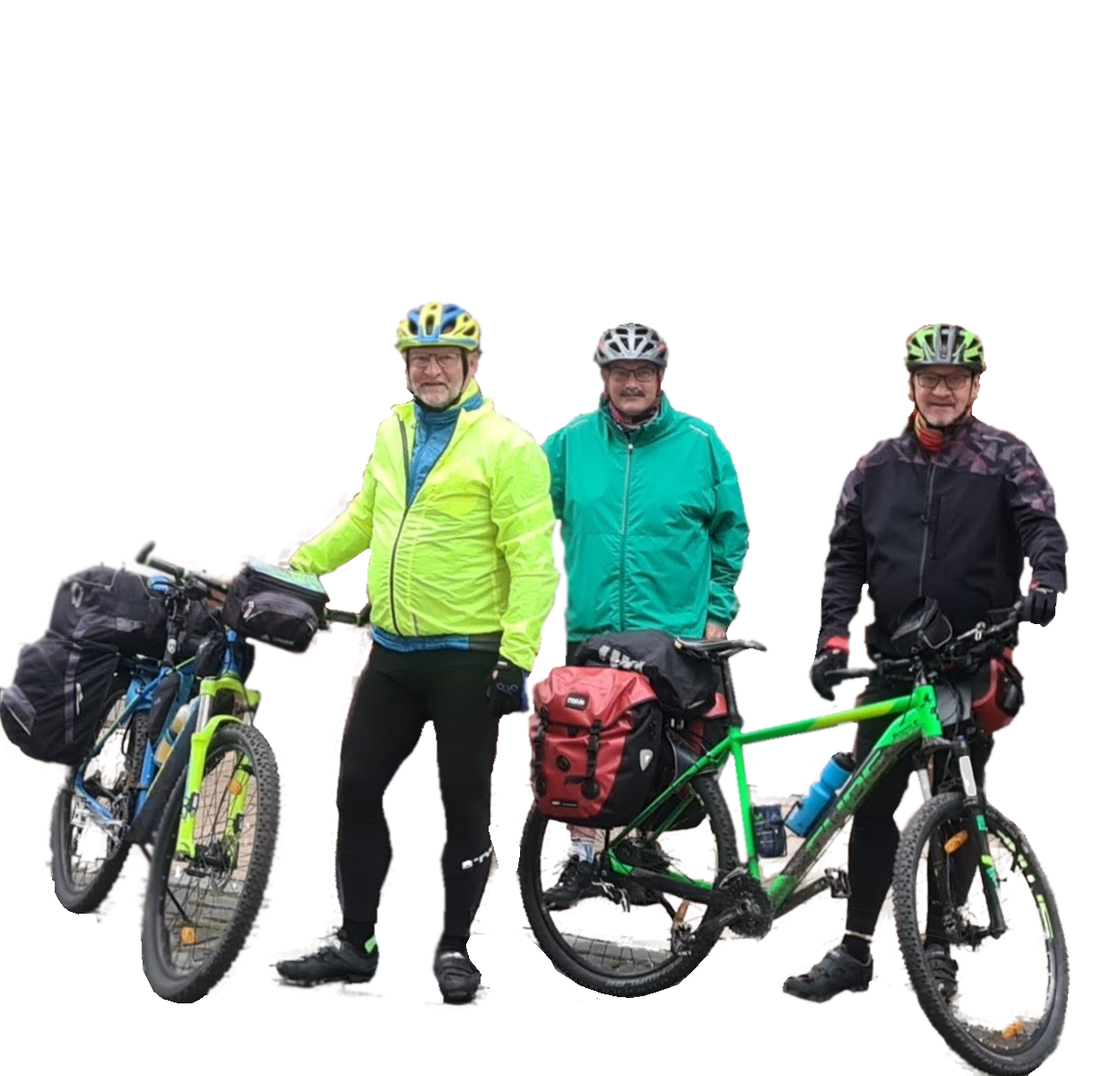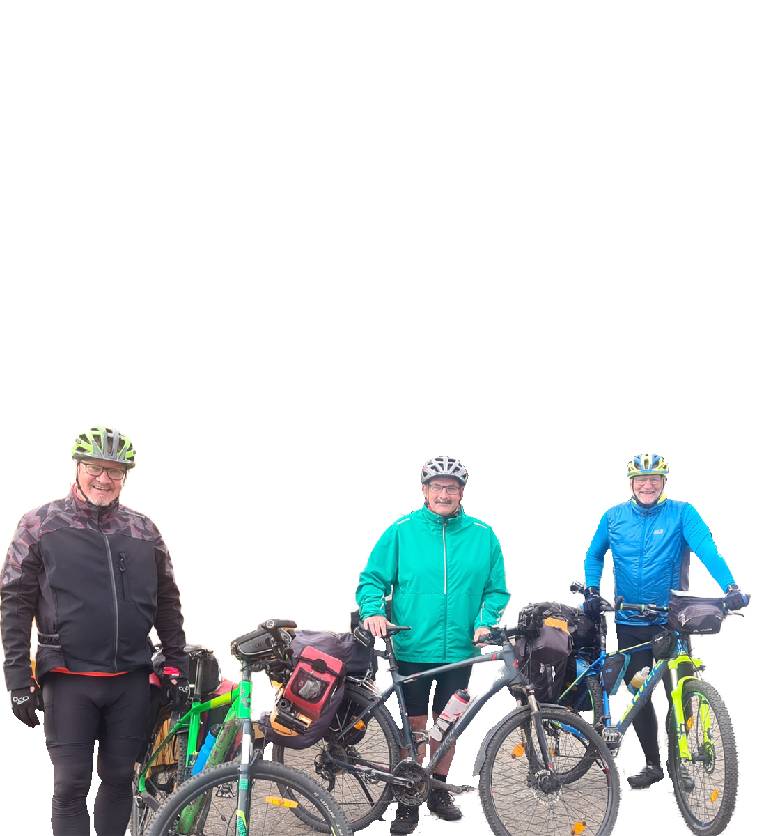 Schnell ins Bad und dann schnell zu Fuß zum vereinbarten Treffpunkt. Die Räder und das Gepäck hatten wir schon am Vortag verladen. Es war ziemlich kühl und die kurzen Radhosen waren mehr als mutig. Nach kurzem Briefing stiegen wir ins Auto und