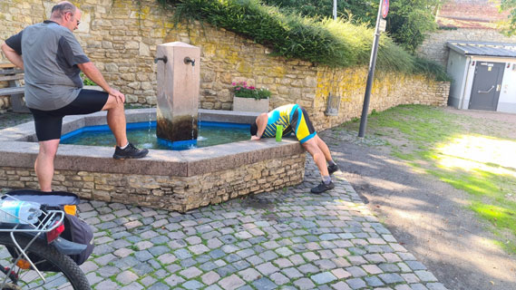Abseits der Strecke kämpften wir uns über Feldwege zur Route zurück. Wir fuhren durch Grünstadt nach Asselheim und vorbei an seinem roten Turm bis nach Bockenheim, an der Weinstraße. Unter dem Haus der deutschen Weinstraße ging es hindurch, weiter durch die Weinberge und durch Wiesen und Felder. Immer schön in der prallen Sonne über Wachenheim, Harxheim und Albisheim bis nach Gauersheim. Hier lockte ein Brunnen mit kühlem Wasser und wir machten eine längere Pause. Mittlerweile waren es über 36°C und wir hatten den größten Anstieg noch vor uns.