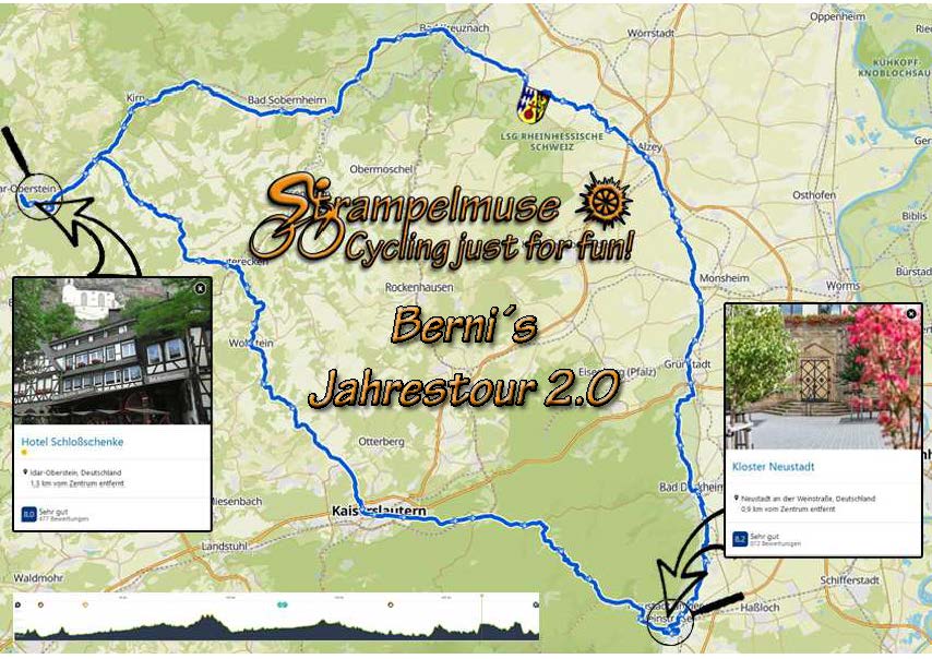 Es ging über Kirn-Sulzbach, Weiherbach und Nahebollenbach entlang der Nahe. Nach einer letzten Schleife fuhren wir in Idar-Oberstein ein. Schon von weitem konnten wir die berühmte Felsenkirche sehen, an deren Fuße unsere erste Unterkunft lag.