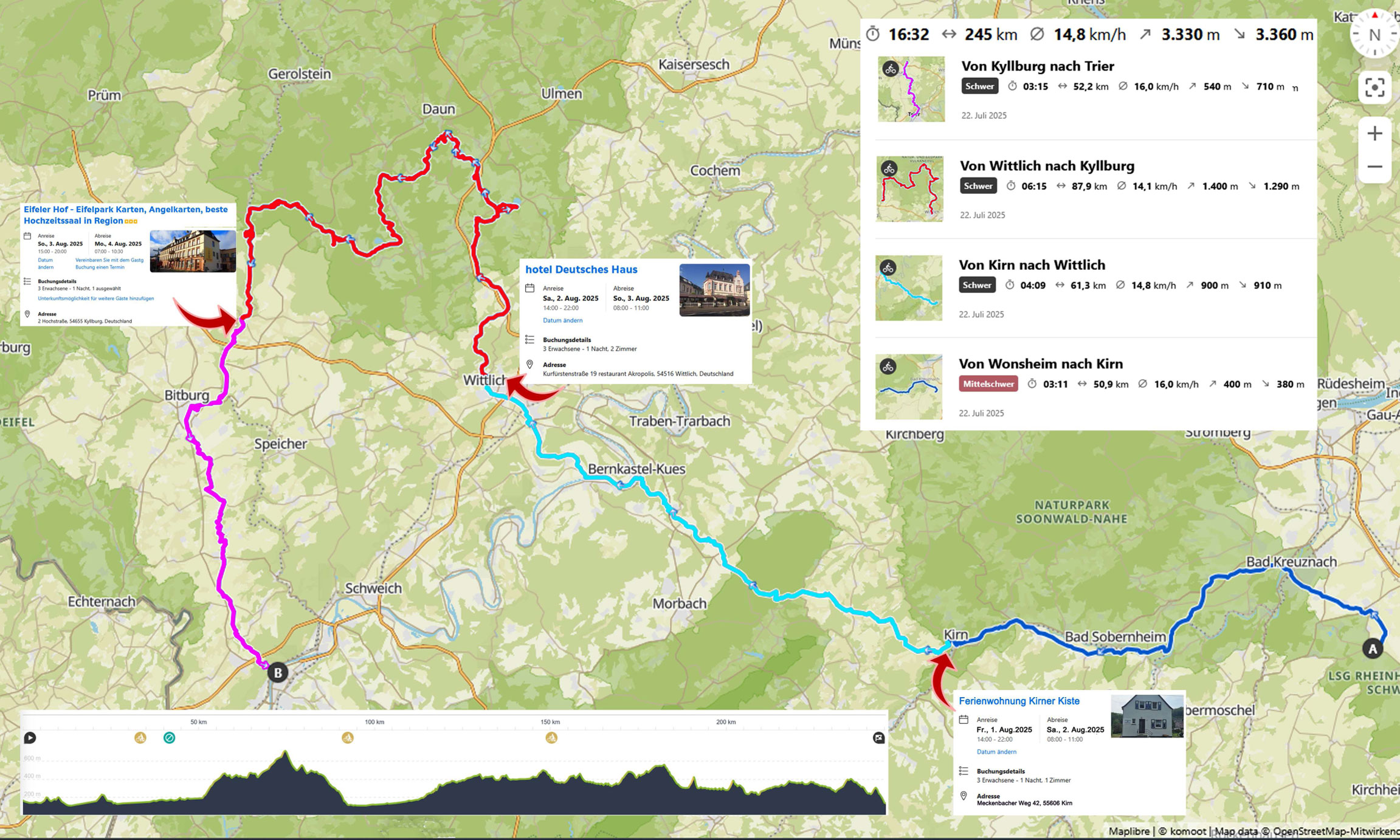 Die heutige Etappe sollte uns etwa 65 Radkilometer und über 800 Höhenmeter bis nach Wittlich bringen.