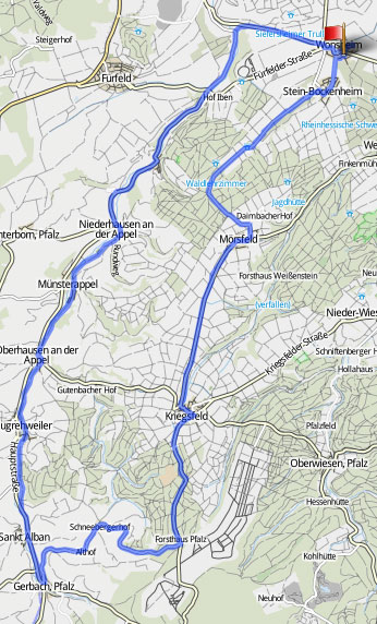 auf der rechten Seite der Walderlebnispfad, dessen Einfahrt für eine kurze Rast genutzt werden kann. Danach fahren wir durch den Wald auf der Landstraße bis nach Mörsfeld.