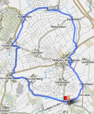 Wir starten in Wonsheim und fahren vorbei am Historischen Rathaus durch das Dorf in Richtung Fürfeld.