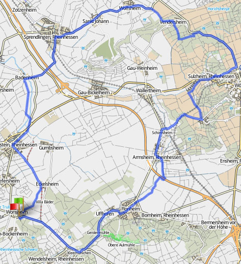 Wörrstadt, um nach rechts in Richtung Sulzheim abzubiegen. Wir folgen dem links neben der Landstraße führenden Radweg bis zur Ortsmitte. Am Dorfbrunnen biegen wir links ab, fahren ein